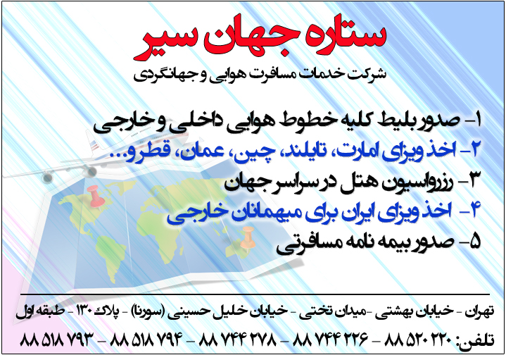 خدمات: 1 - رزرواسيـــــــــــــون هتل در سراسر جهان در كوتــــاه ترين زمان با نــازلترين قيمت اين شركت با دارا بودن انواع سيستم هاي آنلاين رزرو هتل و همچنين همكاران متبحر و با تجربه در كشور هاي مختلف جهان و امكان رزرو آنلاين هتل و صدور واچر در عرض كمتر از 3 دقيقه توانسته است به يكي از بزرگترين مراكز رزرواسيون هتل هاي سراسر جهان در ايران تبديل شود. 2 - اخذ ويز 3- رزرو و صدور بليط كليه خطوط هوايي داخلي و خارجي 4- ويزا و اقامت كشور قطر